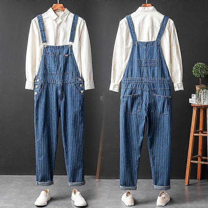 Men Retro Stripe Denim Slim Overall Jumpsuit Jeans Romper Cowboy Coat Pants Suit