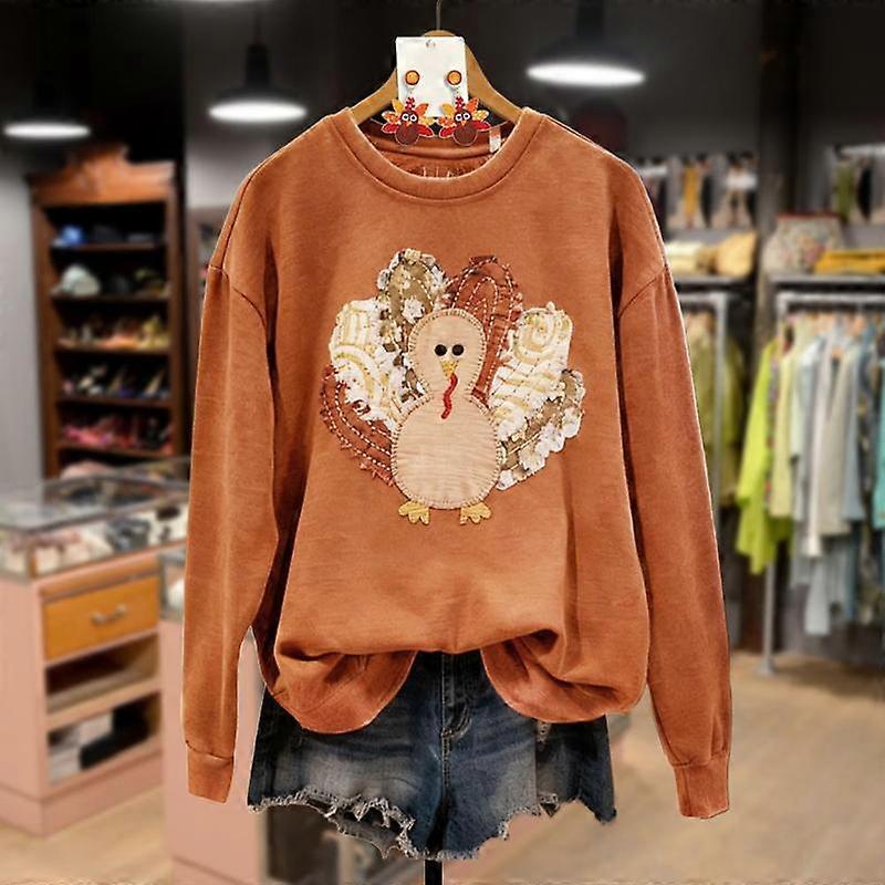 Cherrybetty Cotton Mixed Turkey Print Thanksgiving Sweatshirt Crewneck Casual Wear for Holiday Cheer Piece Womenswear Long Sleeve Crewneck S