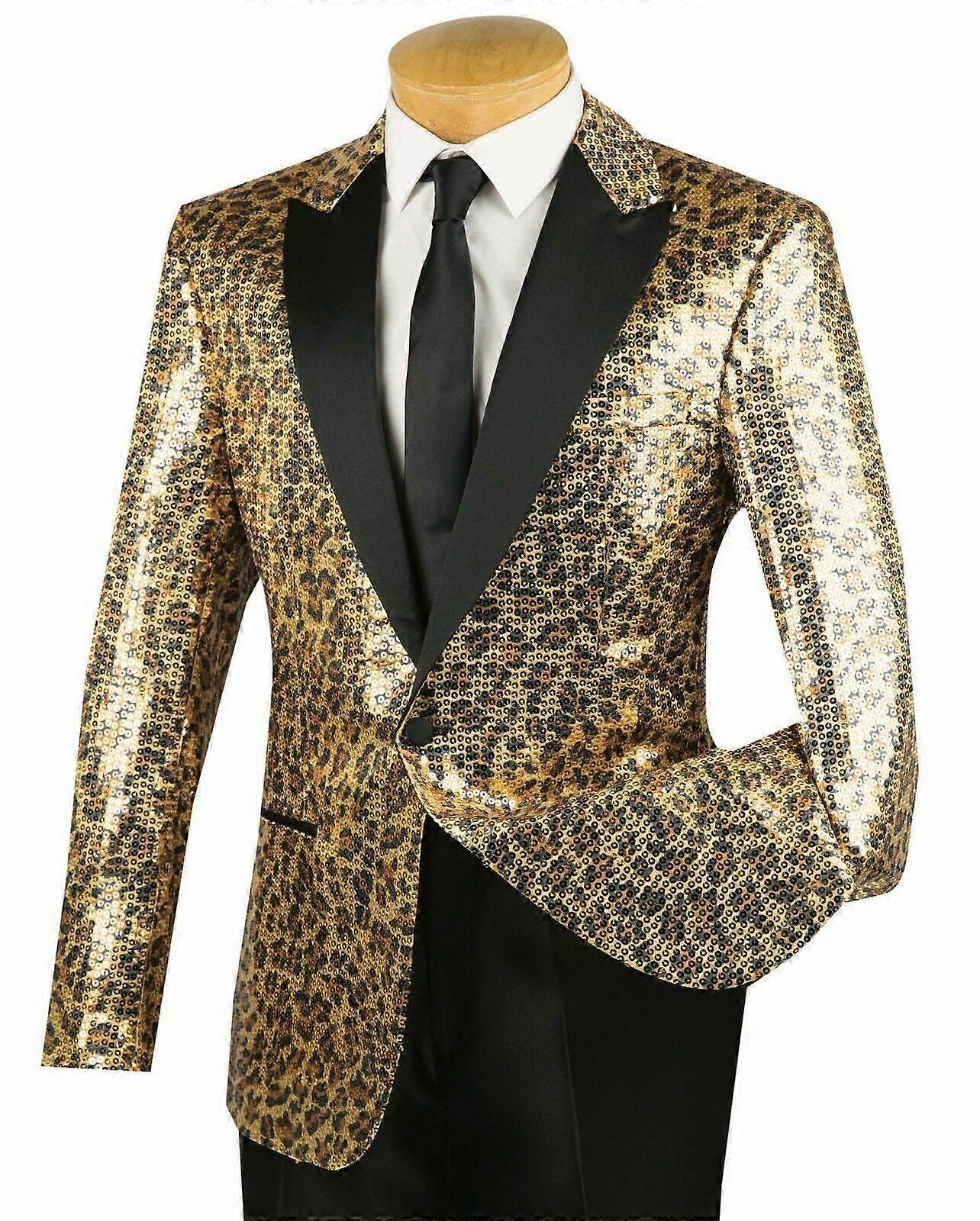 Men's Gold Leopard Print Sequins Peak Lapel Tuxedo Prom Party Dinner Suit Blazer