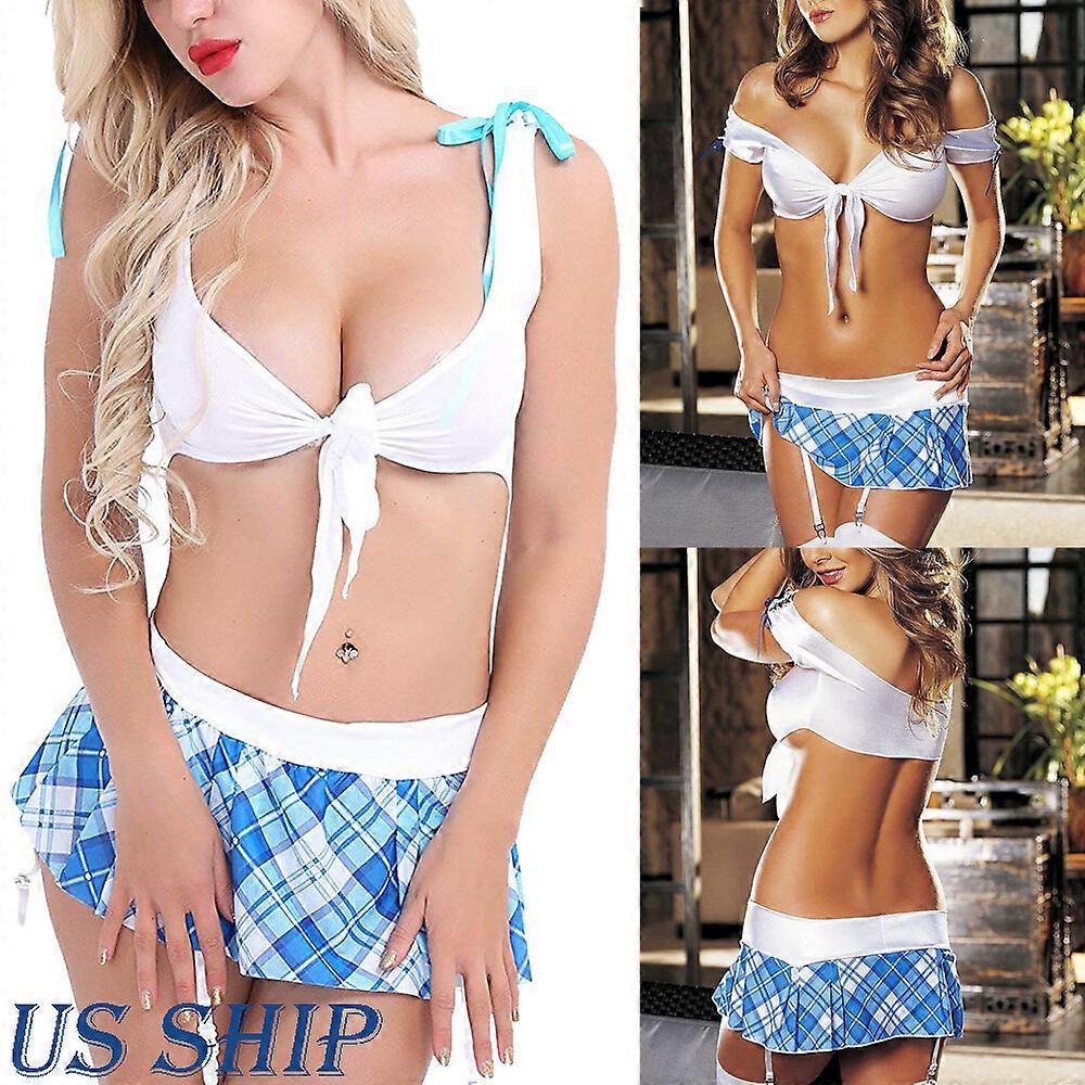 School Girl Costume Ladies Sexy Lingerie Cheerleading Uniform Skirt Garter Belts