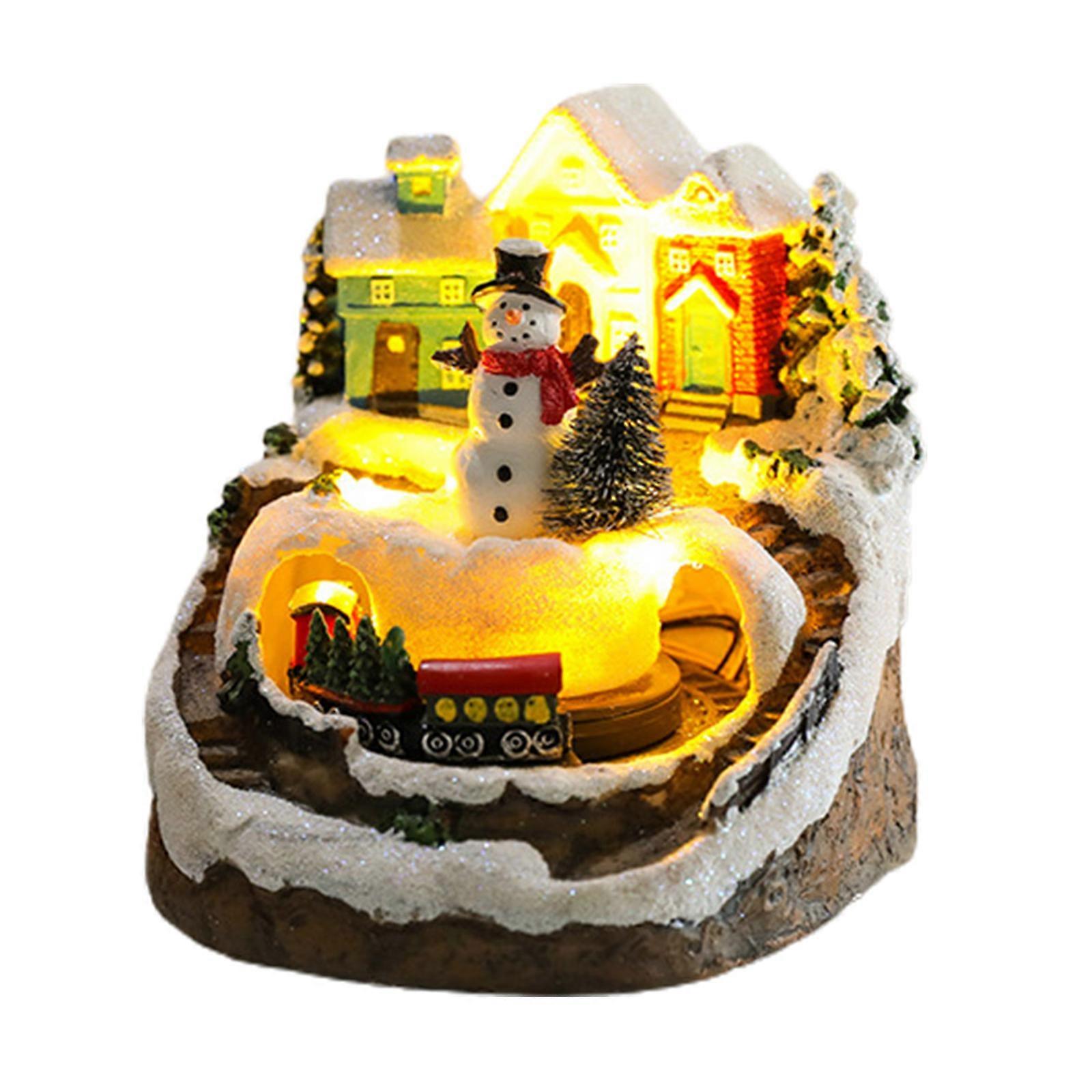 Christmas Village Figurines LED Lights Small Train Christmas House Luminous Landscape Figurines Resin Desktop Ornament Multicolor