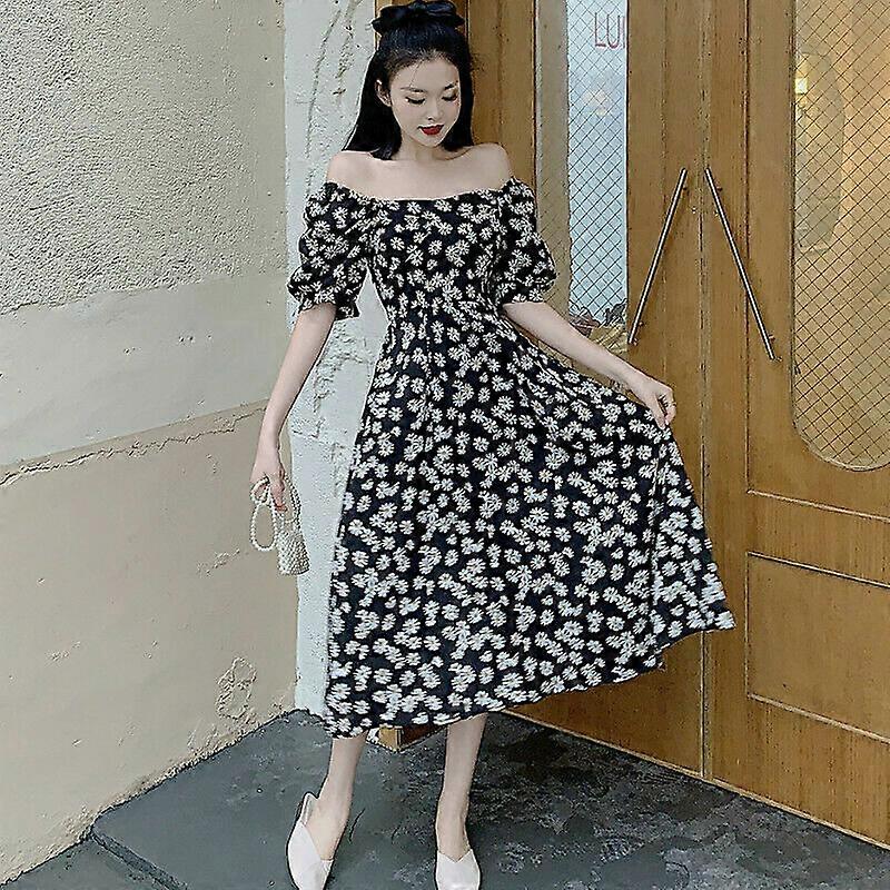 Lady Daisy Floral Dresses Off Shoulder Midi Short Puff Sleeve Black Retro Casual