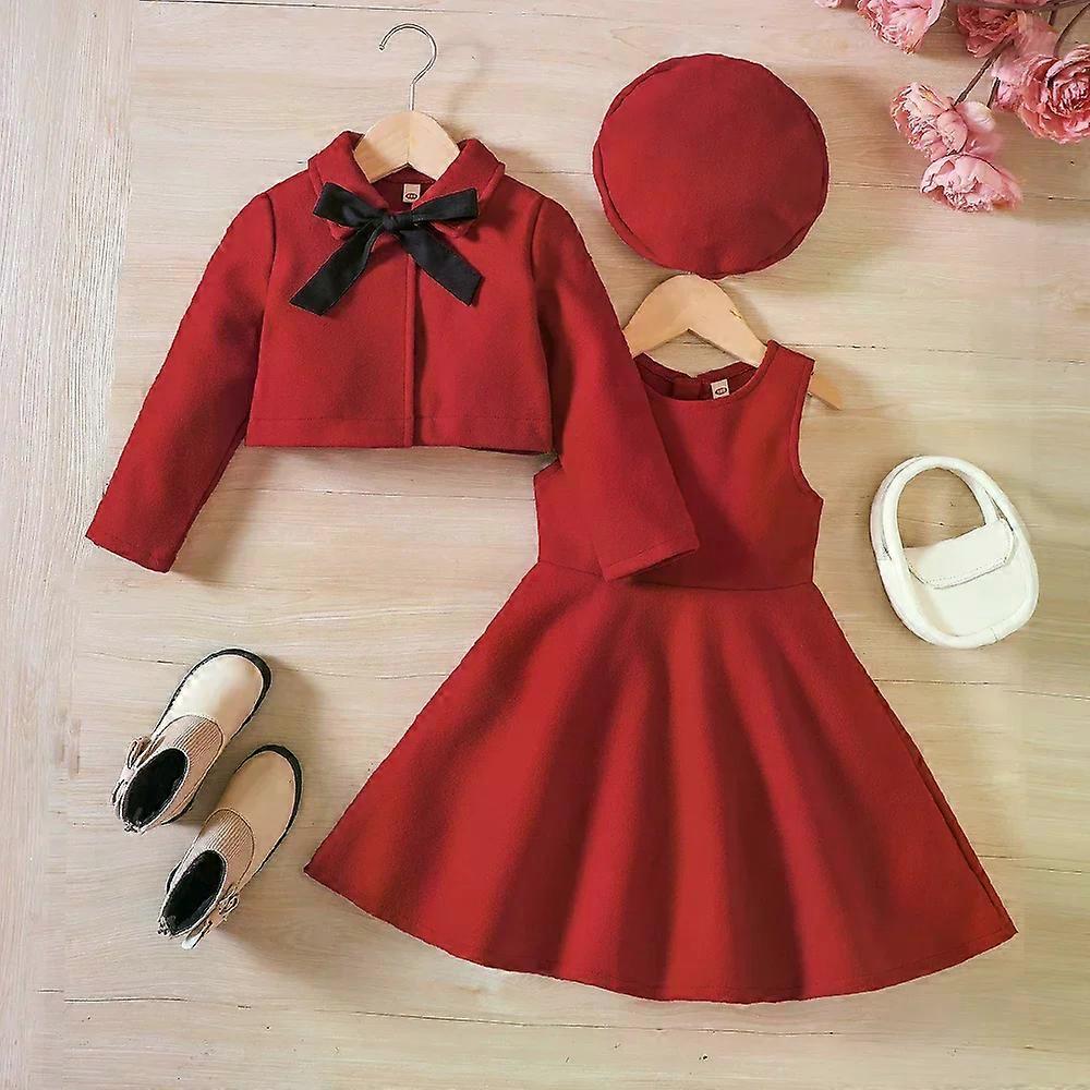 Girls' Autumn/Winter New Bow Fleece Coat+Tank Top Dress+Beret Three Piece Set