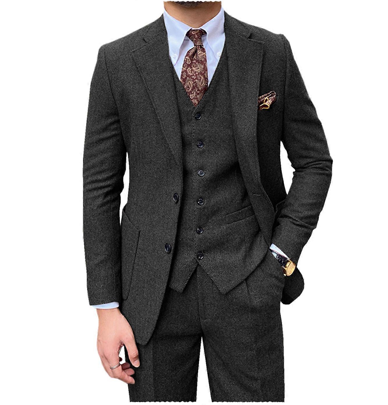 Mens Tweed Suits 3 Piece Wool Herringbone Tuxedos Blazer+Vest+Pants 42r 44r 46r