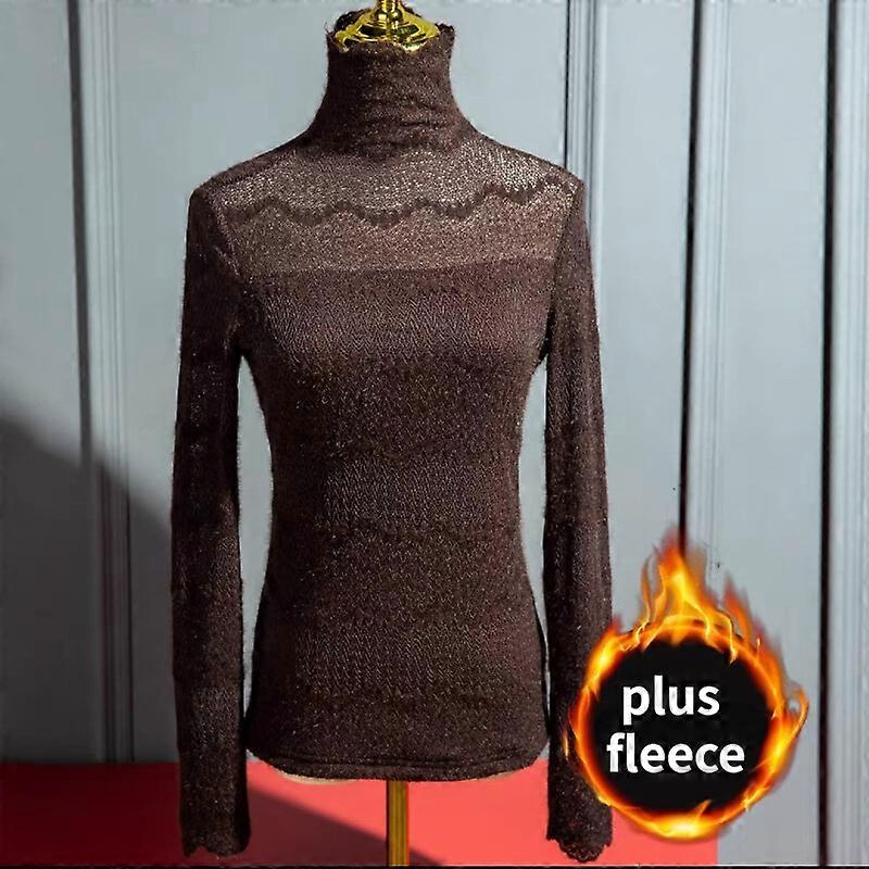 Women Sheer Lace Shirt Hollow Blouse Turtleneck Long Sleeve Tops Slim Flocking