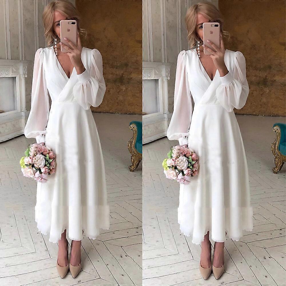 Chiffon Short Wedding Dresses V Neck Long Sleeves Tea Length Simple Bridal Gowns