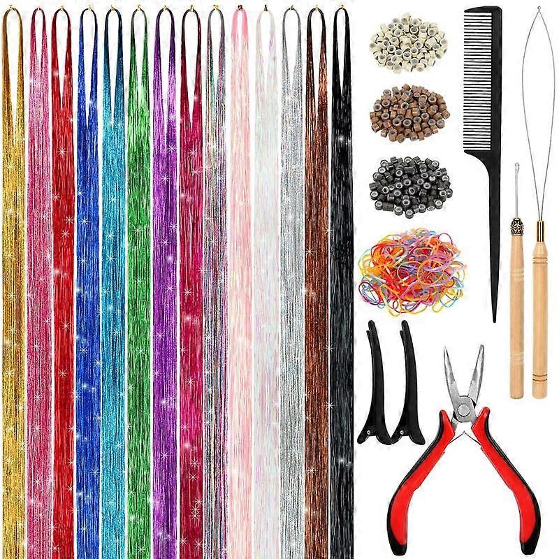 Colorful Heat-Resistant Hair Tinsel Kit with Tools 48 Inches 14-Color Glitter Tinsel Extensions 3500 Strands for Women Girls Kids Festival D