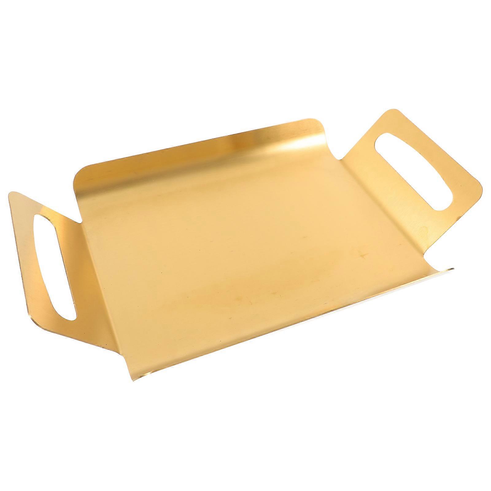 This Korean-style stainless steel serving platter features dual handles for easy carrying. Its rectangular shape and thickened design make it for serving a variety of dishes, from appetizers to desserts. The sleek, polished finish adds a touch of elegance to any dining setting, making it ideal for both casual and formal occasions. Features - Color: Golden -Material:Stainless Steel - Size: 28.00X17.00X4.80cm/11.00X6.68X1.89in -stainless steel material: made from stainless steel, ensuring durability and resistance to wear and tear -Thickened design: the reinforced construction makes the tray sturdy and capable of holding heavy items without bending or breaking -Rectangular shape: ideal for various settings such as restaurants, bakeries, and cafes, catering to diverse needs -Versatile use: It's for serving dishes, tea, baking, bread, cakes, and desserts, enhancing efficiency in different scenarios -Elegant style: the simple and stylish design adds aesthetic appeal, making it a decorative piece in any setting Package list: 1 x Rectangular Serving Platter with Handles