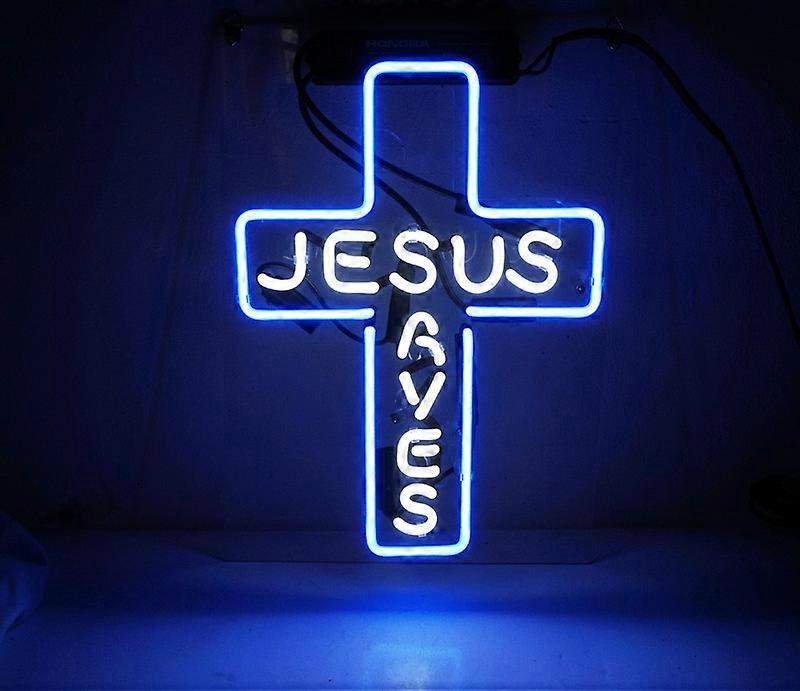 Jesus Saves Cross Real Glass Neon Sign - White Color Inspirational Wall Art for Church, Home & Spiritual Gift - 14"x9"