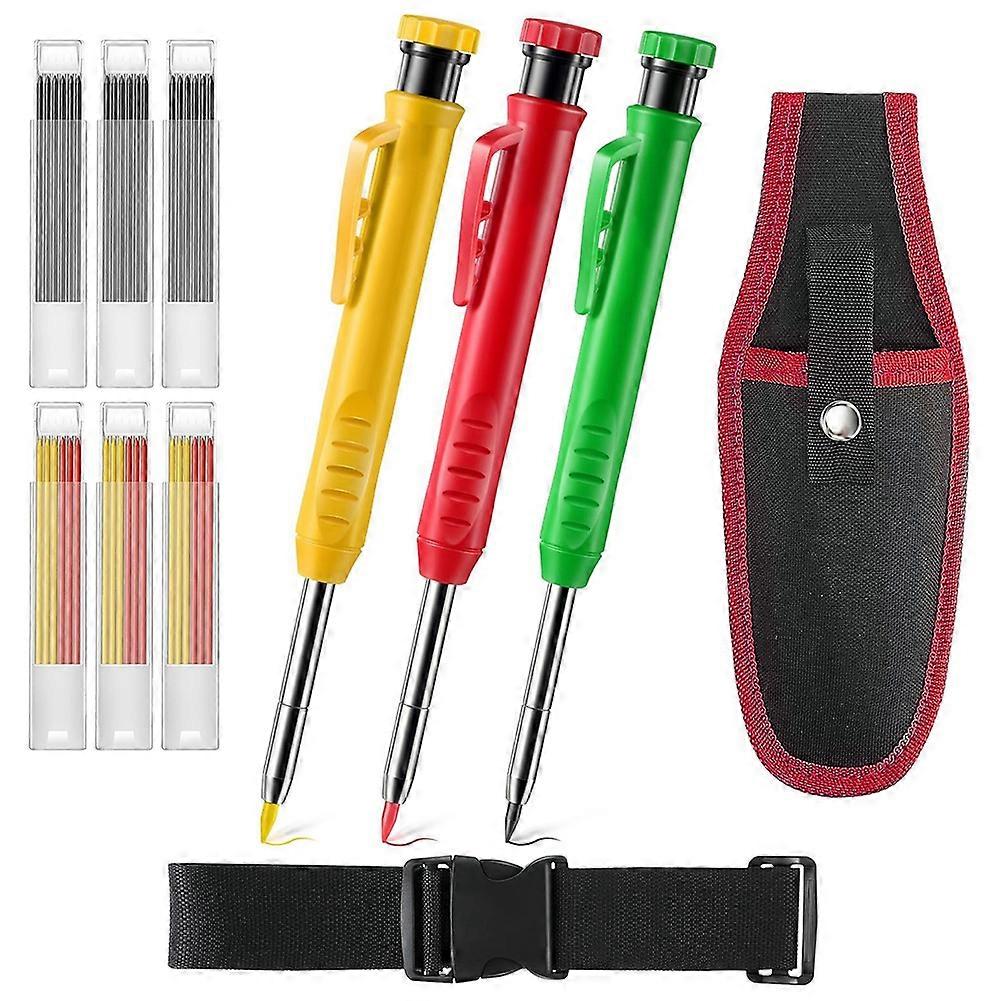 Carpenter Pencil Set: Our carpenter pencil set includes 3 packs of mechanical carpenter pencils (green, red, yellow), 36 refills (18 black, 9 red, 9 yellow) in total, and a small tool pouch for carpenter. The complete mechanical construction pencil set allows you to finish your work faster and easier. Portable Tool Pouch: In addition to these woodworking pencils and refills, you also get a small tool pouch with belt, which makes it easier for you to place and take the woodworking pencil, greatly improving the convenience during construction. Carpenter Pencil with Sharpener: Our construction pencil comes with a built-in sharpener that screws into the top of the mechanical construction pencil. The built-in sharpener allows you to adjust the thickness of the pencil tip to help you complete your marking work better. Deep Hole Maker: The deep hole maker pencil is designed with a 45mm long tip, which is more convenient for marking in the small hole or in other tight areas that other traditional wooden carpenter markers cannot reach. Wide Application: With a 2.8 mm thick tip, the mechanical pencil is much thicker and clearer than normal pencils, suitable for various surfaces, such as metal, wood, plastic, paper, wall, and so on. When the work is finished, the marks can be easily wiped off with a wet paper towel. Easy to use: The mechanical woodworking pencil is easy to hold, which will improve the accuracy of marking work and will not make you feel uncomfortable for a long time work. This is a great gift choice for carpenters. Reliable material: Our mechanical carpenter pencil set is made of quality materials, the pencil refill is durable and smooth, the tool belt pouch is made of thick fabric, the mechanical architect pencil holder is made of sturdy plastic. Size: Carpenter pencil: 5.7 x 0.5 inches/14.5 x 1.3 cm Pencil refill:
