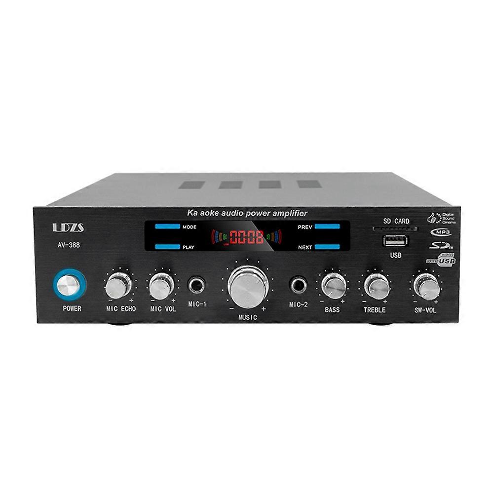 Features: Enhanced Audio Experience: Dive into the world of high fidelity with this powerful 5.1 channel home power amplifier. Versatile Connectivity: Includes a built-in FM radio and USB port, enabling you to enjoy your favorite radio stations or play music directly from USB drives. User-Friendly Controls: Comes with a convenient remote control, making it easy to adjust settings from anywhere in the room. Whether you're hosting a party or relaxing at home, this amplifier offers the control you need. Specifications: Amplifier model: AV-388 Amplifier type: HIFI Amplifier channel: 5.1 Output power: 450W Output impedance: 4-16 Ω Harmonic distortion: Less than 1kHz 0.05% 4W High frequency control: 10KHz ± 12dB 220mV47K Bass control: 100Hz ± 12dB 220mV47K Frequency response range: 20HZ-20KHZ Bluetooth: Supports USB: Supports SD card: Supports Microphone: Supports Reverb adjustment: Supports FM radio: supports FM frequency range: 87.5-108MHz Remote Control: Supports High pitch adjustment: supported Bass Adjustment: Supports Due to different batches, there may be differences in product printed text, which will not affect use Plug Type:US Plug,it applies to Canada, India,Mexico, Thailand, the United States, the Philippines,Taiwan and so on. Voltage: AC110V Material: iron colour: black Package Contents: 1 x Bluetooth amplifier 1 x Remote control
