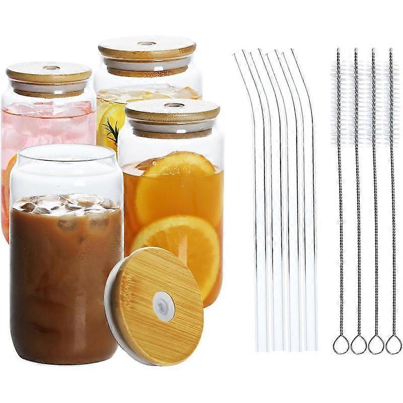 4- glass cup set, 16 ounces (approximately 453.6 grams), 4 glass cups with and straws - coffee cup, drinking, cup, cute , -4 cleaning bru