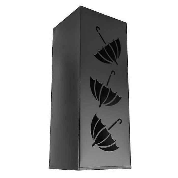 Metal Our umbrella stand measures 6.3"W x 6.3"L x 16.5"H. Perfect size design that offers plenty of space for your long umbrellas. Reliable Quality: This square umbrella holder is made of premium metal material that offers a safe and serene stand for your umbrellas without tipping over. Hollow Design: This indoor umbrella holder features an original openwork with rain motifs,which provide ventilation to help dry faster and highlight your umbrellas. Elegant Decor: The black umbrella stand boasts sleek, attractive design, bringing modernity and elegance to your interior, even on sunny days. Versatile Holder: This umbrella holder is great to organize umbrellas, canes, wrapping paper, etc. Suitable for entryway or door of any home, office, apartment, hotel, bars, etc.