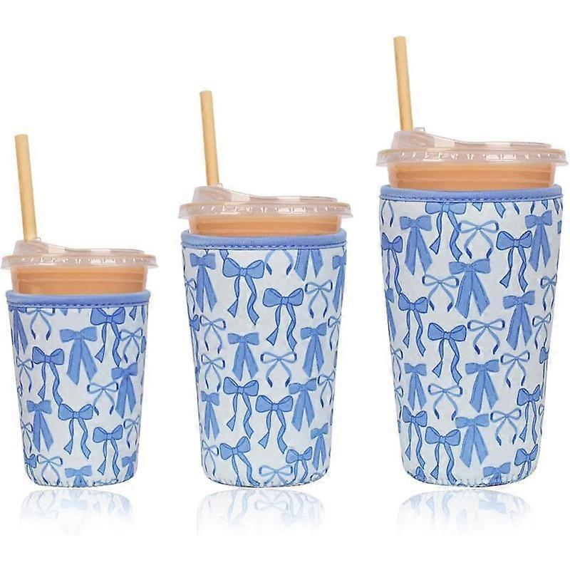 Insulated Neoprene Iced Coffee Cup Sleeve, Durable Drink Sleeve for Cold Beverages, Beverage Holder for Iced Coffee, Blue Bows