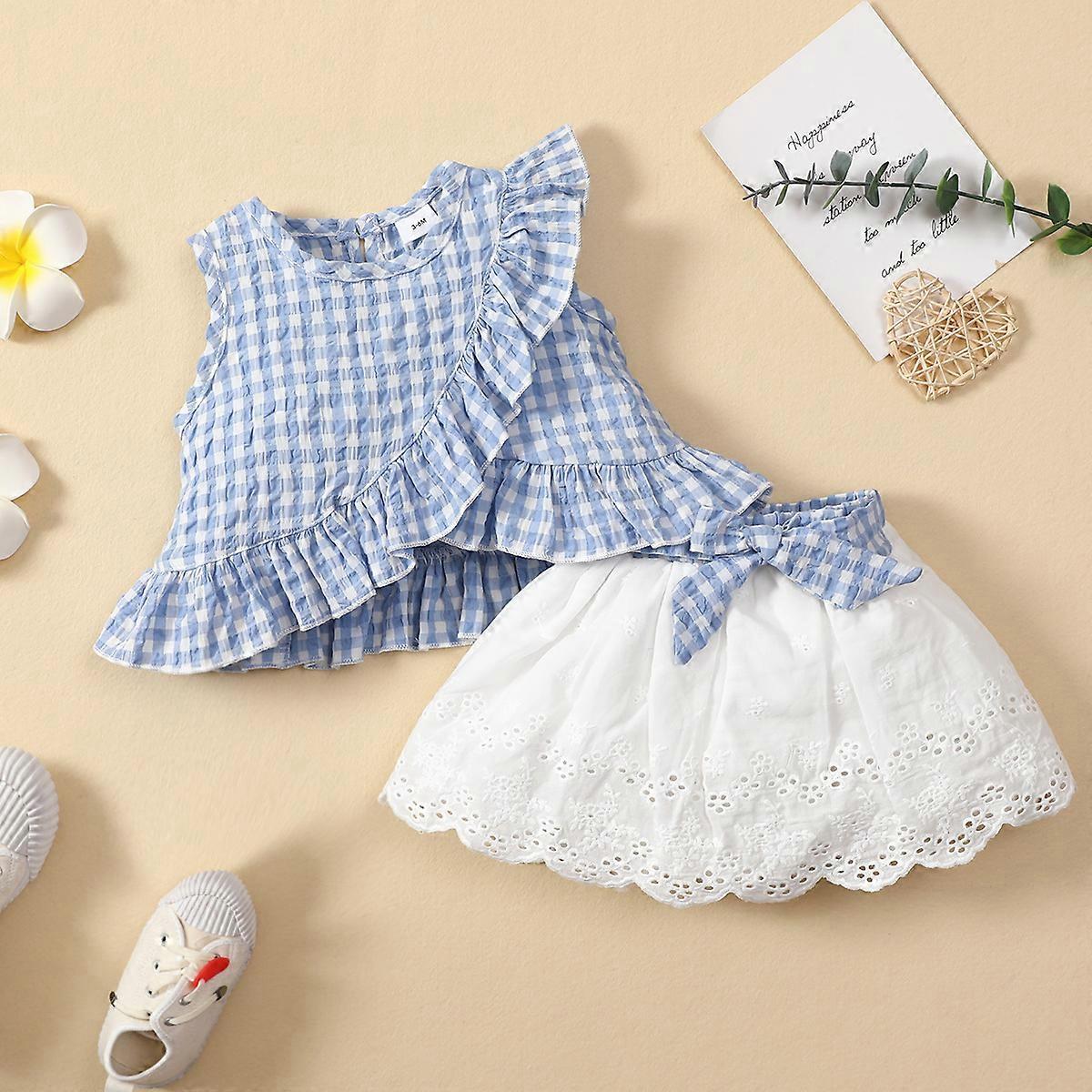 Summer Baby Girl Sleeveless Flounce Blue Plaid Top &Skirt Outfits For 1st Birthday Party Baptism Eid Beach Holiday Dress Up