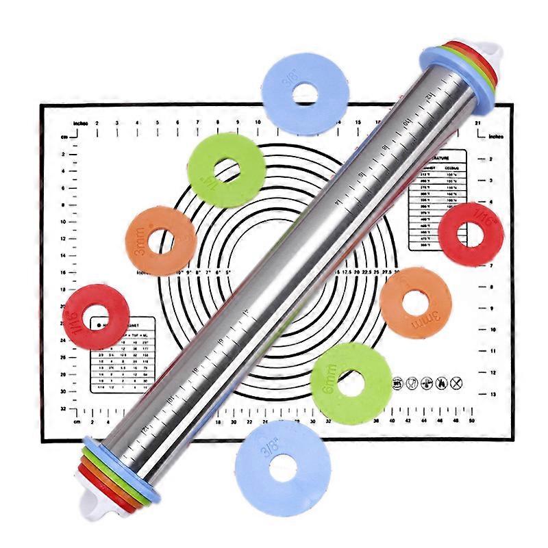 Rolling Pin & Pastry Baking Mat Set, Rolling Pins w/ Adjustable Thickness Rings, Stainless Steel Dough Roller for Baking Fondant, Pizza, Pie, Pastry