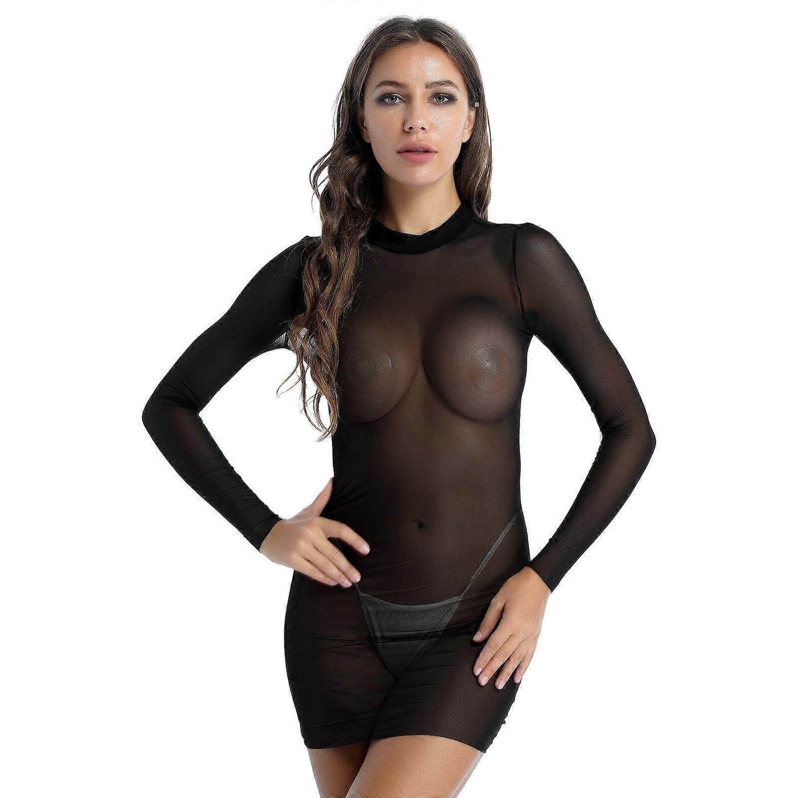 Women Mini Dress Bodycon Mesh Sheer See Through Long Sleeve Cover Up Beach Dress