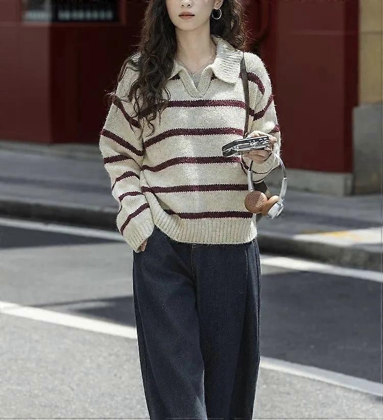 Retro Red Striped Loose Fit Pullover Knitwear Short Style Turn-down Collar Women's Fashion Autumn New Arrival Versatile Sweater