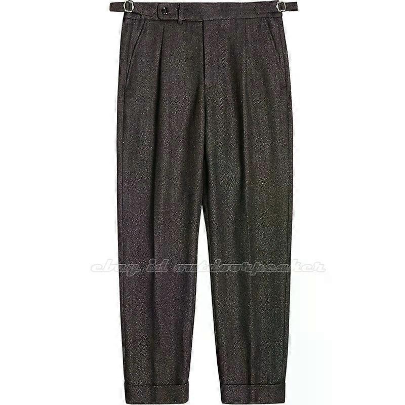 Men's Retro Woolen Gurkha Suit Dress Pants Straight Herringbone Tweed Trousers
