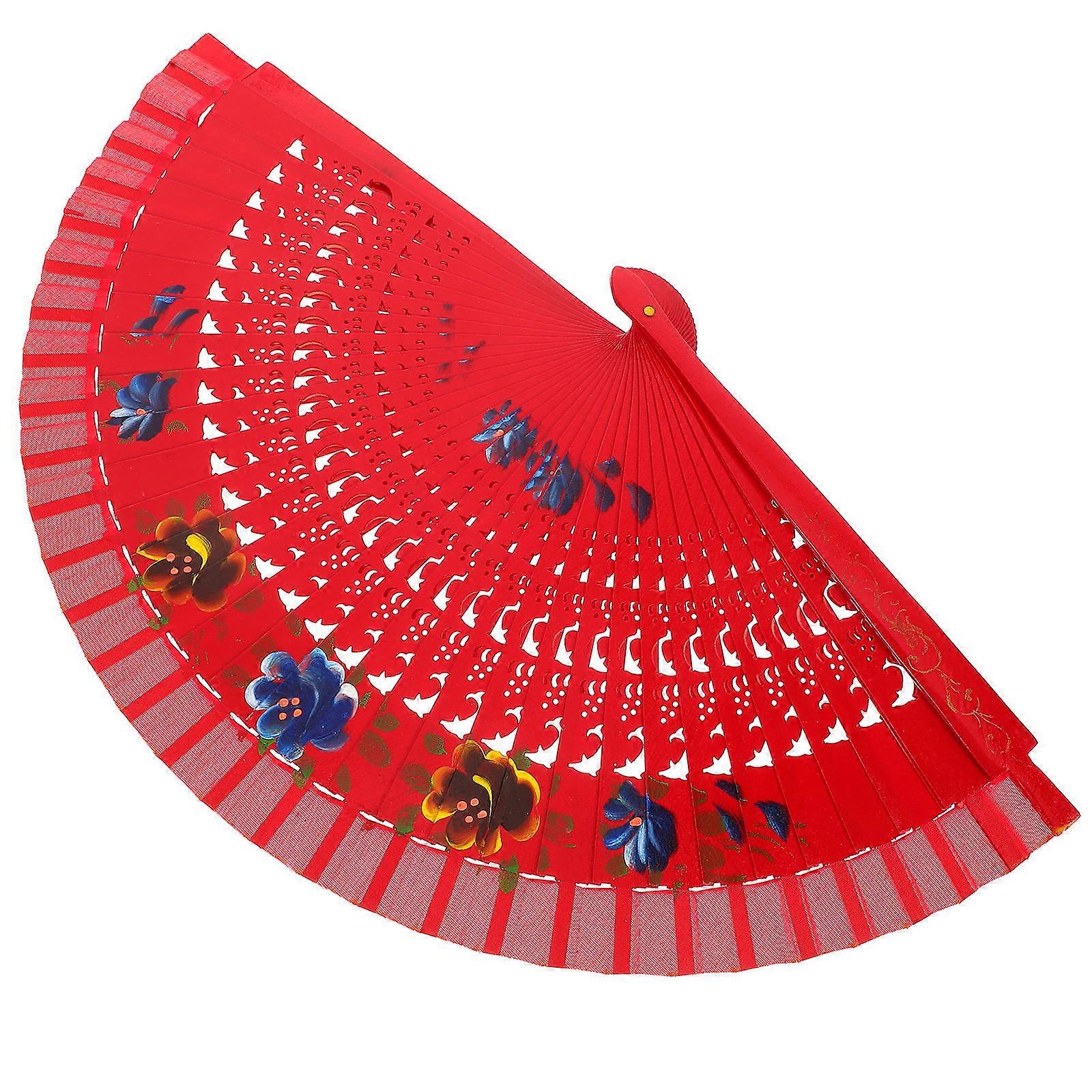 Red Wooden Hand Fan with Hollow Pattern for Summer Dance Performances and Decorative Use 10.5 Inches