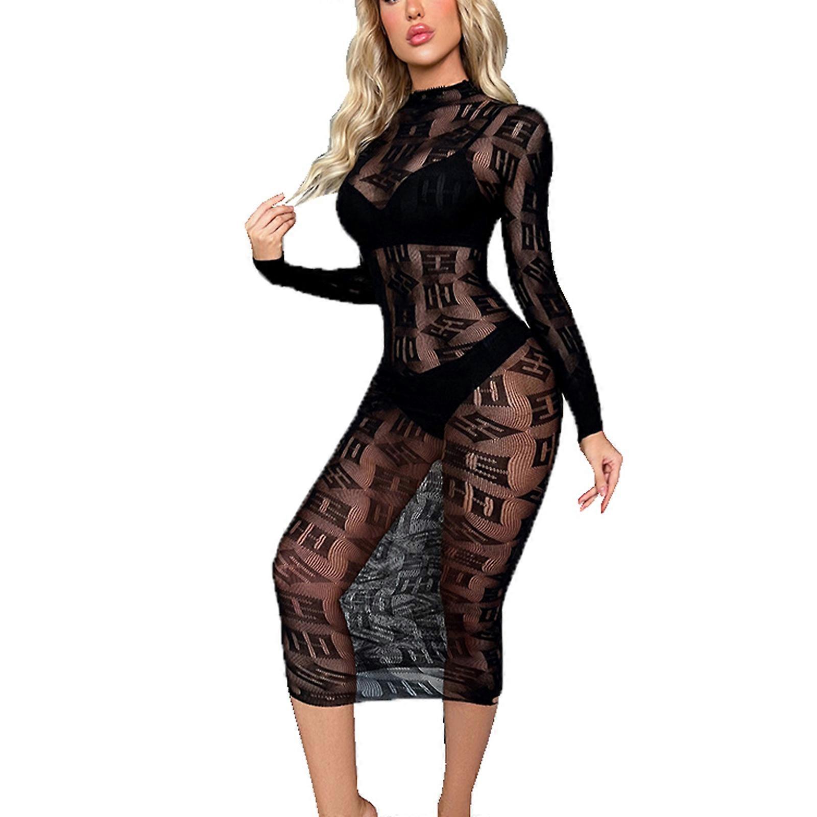 Womens Sexy Sheer Mesh Bodycon Dress See-through Long Sleeve Nightwear Clubwear