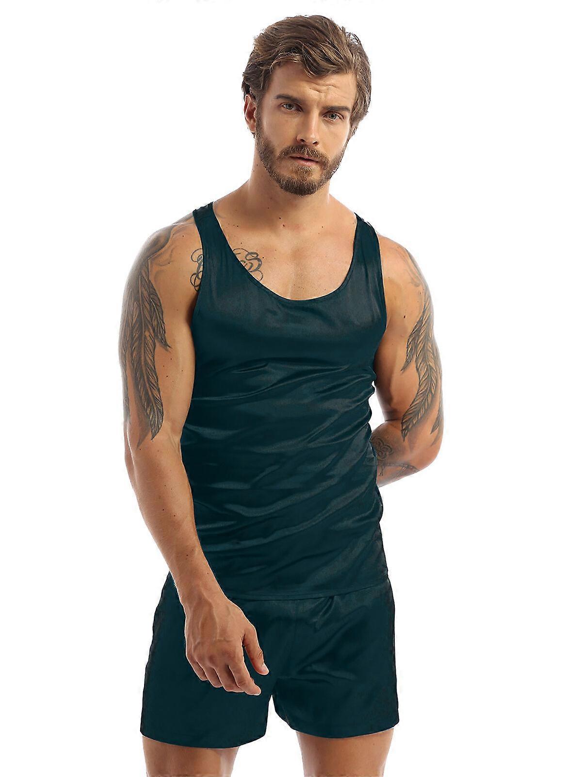 Men Soft Satin Pajamas Set Solid Sleepwear Homewear Lounge Sleeveless Nightwear