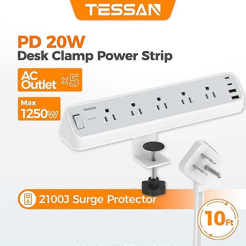 TESSAN 1250W Desk Clamp Power Strip 10 Ft, 2100J Surge Protector, 5 Outlets with 2 USB C 2 USB A, Flat Plug Extension Cord with Multiple Out