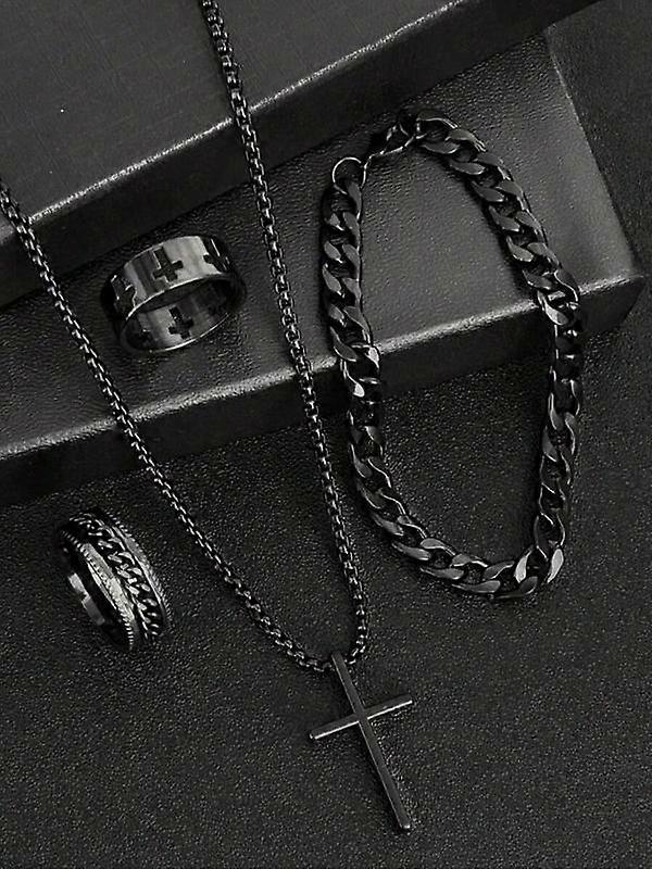 Men's Fashion Jewelry Set, Casual Trendy Cross Pendant Necklace & Bracelet & Ring, Fashion Jewelry for Party, Daily Decor, Trendy All-match