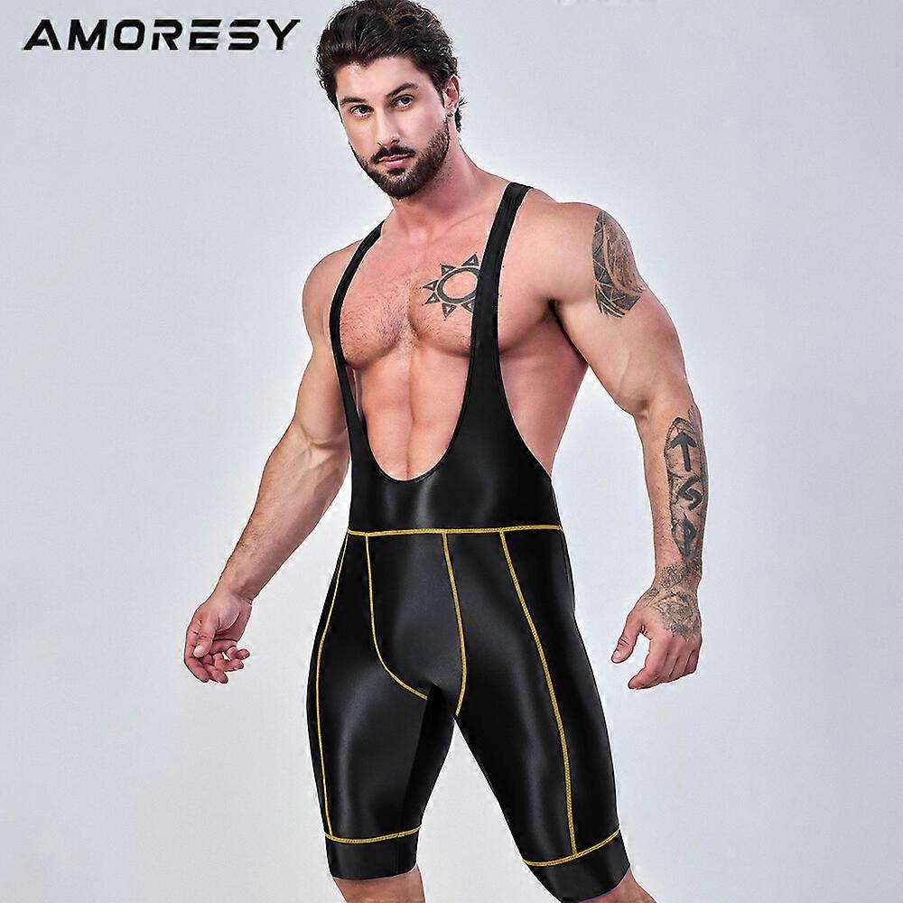 AMORESY Men's Glossy Satin Tracksuits Cycling Overalls With Suspenders Leotards