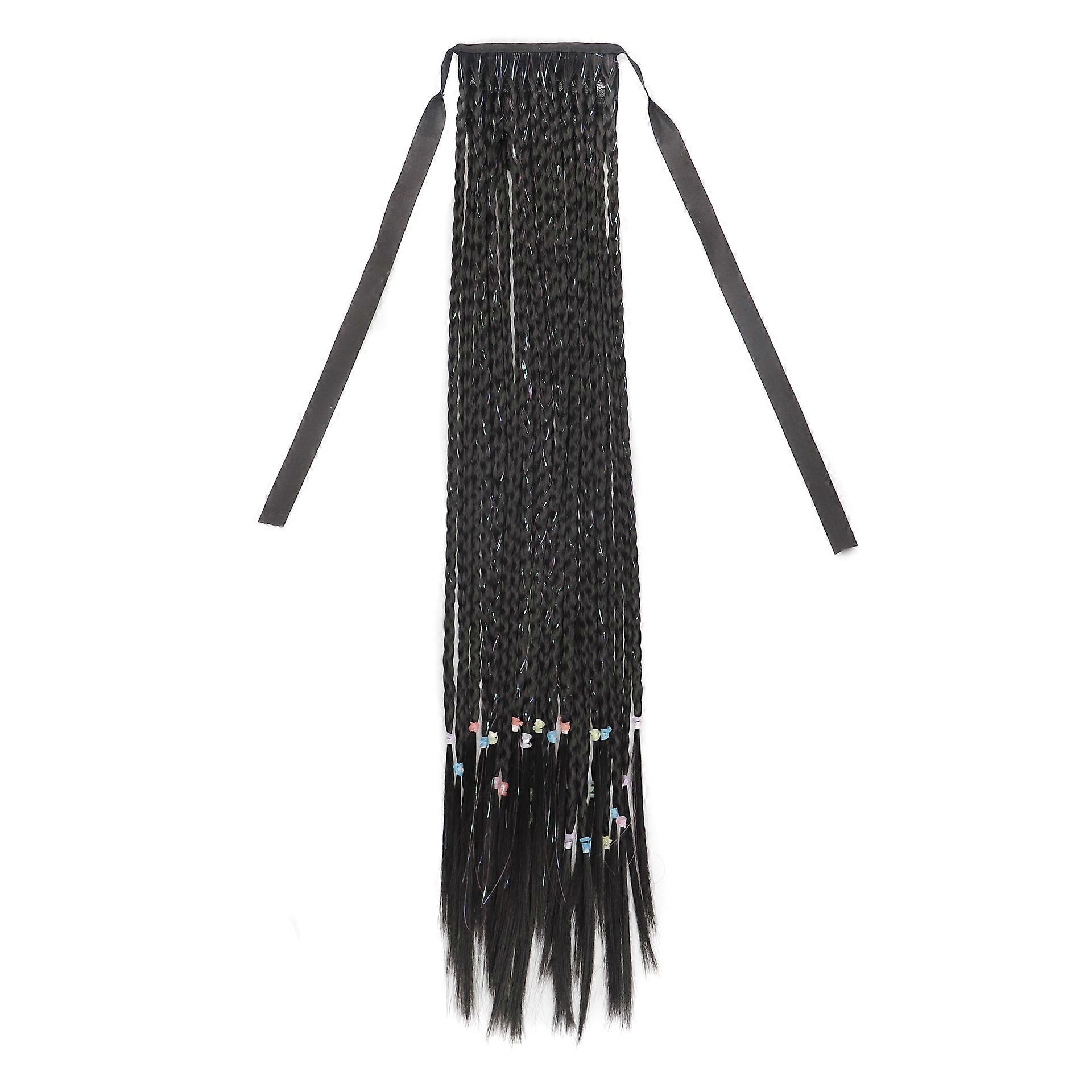 Women's wig ponytail with gold and silver thread hand-woven fine braids, tied with a shiny braid.