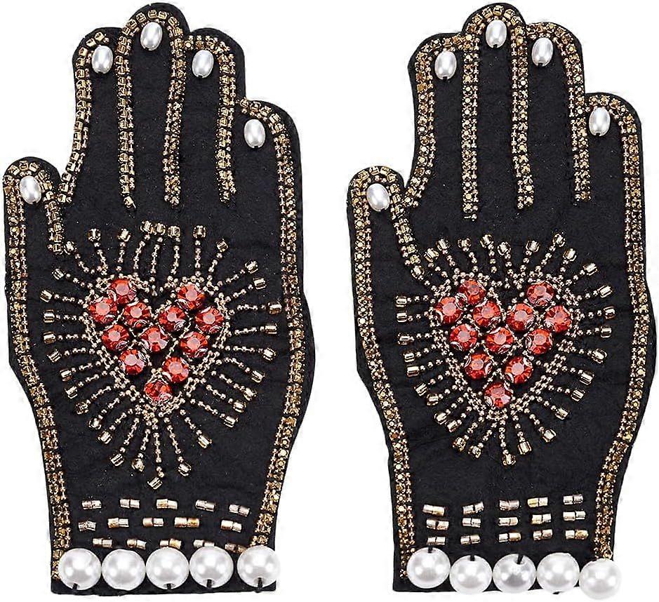 2Pcs Rhinestone Hand Beaded Patch Black Palm Beaded Sewing on Patches Handmade Peach Heart Beaded Pearl Decorative Applique for Jeans Jackets Clothing