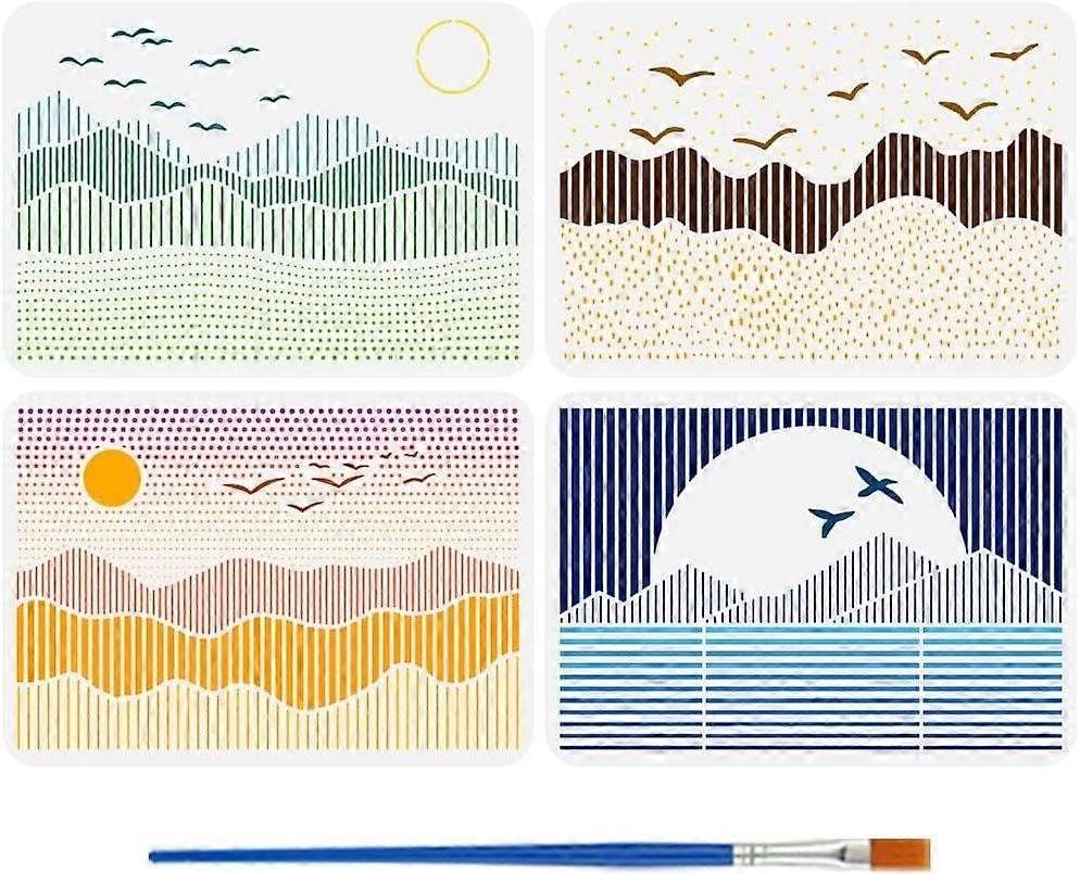 4 PCS Line Scenery Painting Stencil with Brush 8.3x11.7inch Sun Mountains Template Flying Birds Stencil Reusable Sunrise Sunset Template Nature Theme