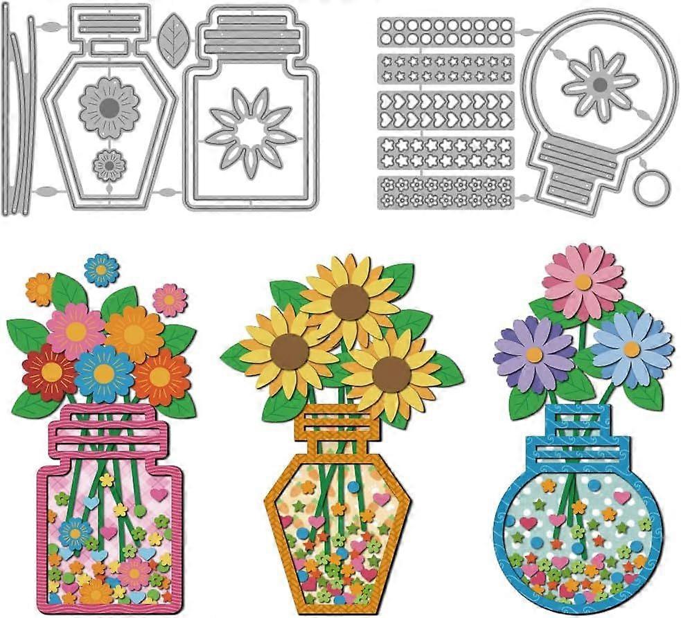 Flower Vase Design: The die cutting design is novel there are round rectangular vases daisies sunflowers and other flowers small stars petals love hearts round patterns creative die cutting can help you complete your DIY crafts to meet your needs of use. Product Size:The 2 die cut sizes are 146×95mm/5.7×3.74 inch 138×96mm/5.4×3.8inch they have the same thickness of 0.8mm/0.03inch please refer to the picture for the detailed dimensions enough quantity to meet your usage needs. Durable Material:Cutting dies are made of high quality carbon steel material die-cutting is sturdy and durable not easy to wear and tear fine workmanship and clear patterns are perfect for long-term use die-cutting can be washed and reusable. Easy to Operate:Place the cutting die on the card and cut out the pattern for project decoration easy to operate can stimulate imagination and creativity you can exercise hands-on skills with your family enjoy your craft time add surprise and charm to your crafting projects. Multiple Uses: Cutting dies are suitable for scrap-booking paper cards embossing card making photo albums DIY crafts and can also be used to make a variety of invitations greeting cards postcards paper crafts gift bag decorations. Create beautiful shapes for your favorite cards and papers.