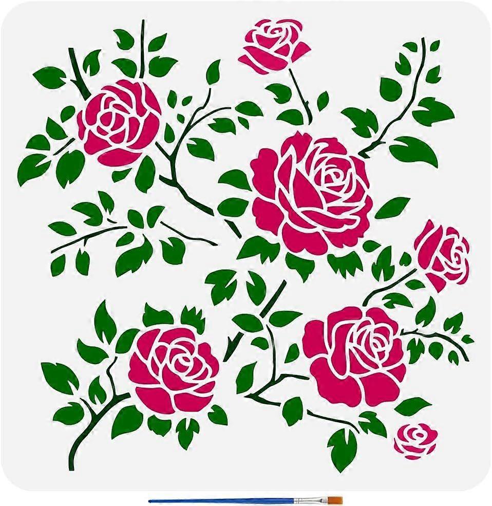 Rose Flowers Stencil for Painting with Brush 11.8x11.8inch Reusable Rose Leaves Template Hollowed Rose Tree Brocade Stencil Plastic PET Plant Theme Te