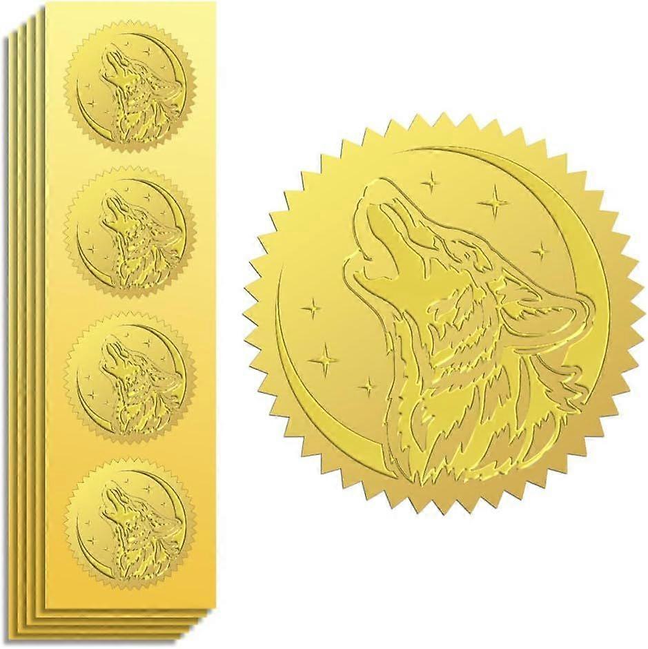 Gold Foil Sticker Seal Embossed Howling Wolf and Moon 2 Inch 100Pcs Self Adhesive Golden Around Embossing Decals for Invitation Certificate Envelope S