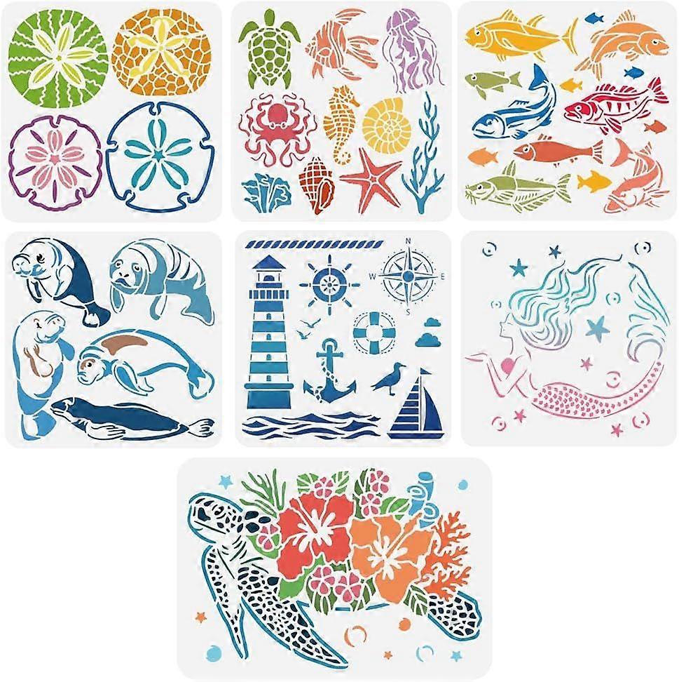 7Pcs Sea Creatures Painting Stencil Turtle Octopus Lighthouse Ocean Theme Plastic Reusable Drawing Templates for Scrapbooking Fabric Floor Furniture W