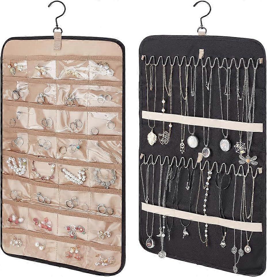 Hanging Jewelry Organizer Double-Sided Jewelry Holder 32 Pockets Accessories Organizer Storage Roll 24 Hooks Necklace Hanger for Earrings Necklaces Br