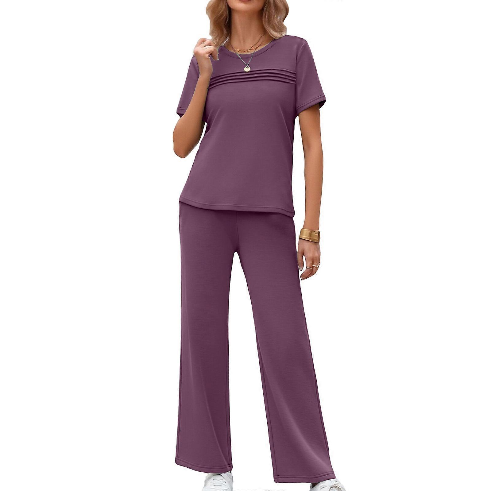 Two Piece Suit for Women Travel Vacation Outfits Short Sleeve Casual Sets Side Slit Wide Leg Pants Purple XL