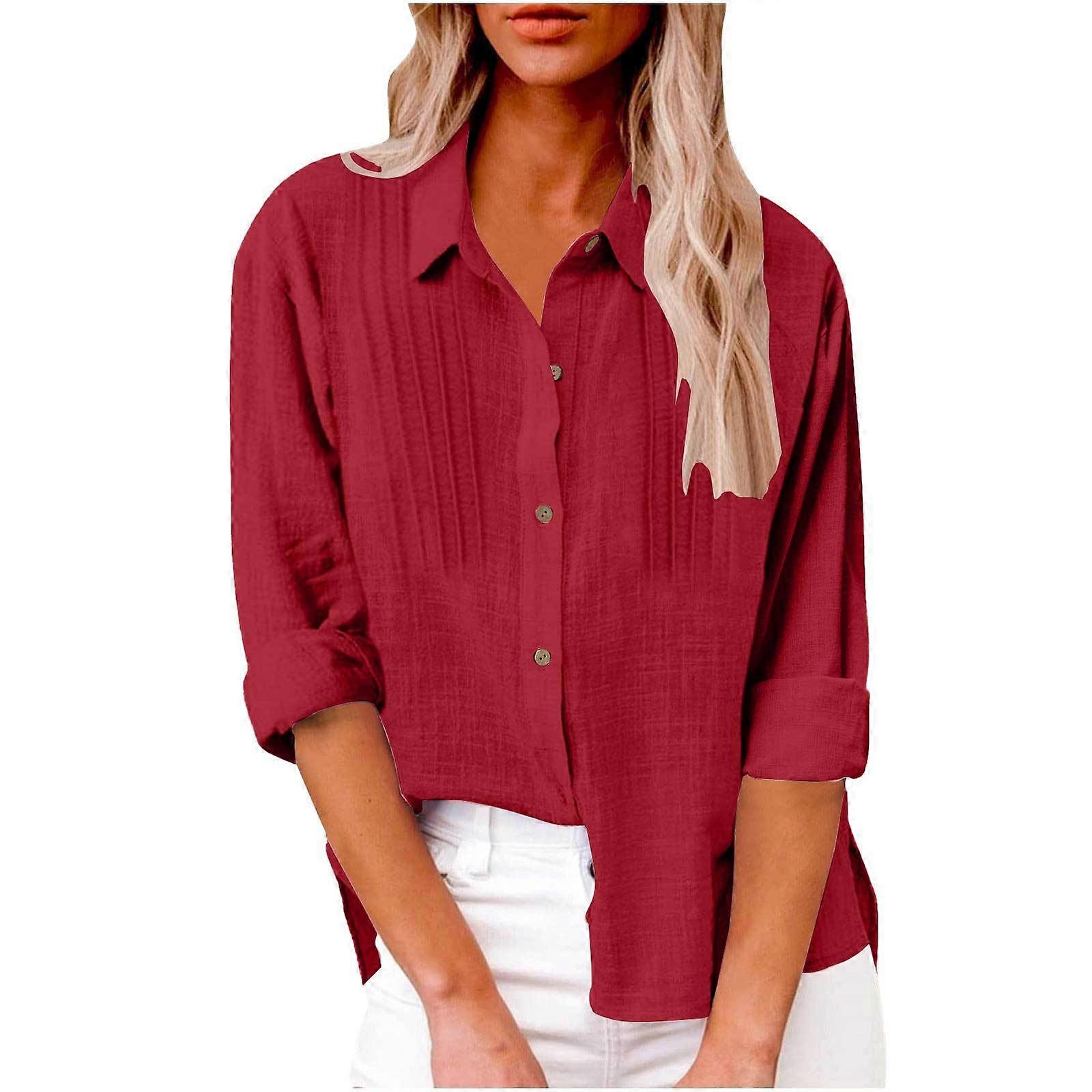 Women's Elegant Linen Cotton Lapel Neck Fold Shirt Long Sleeve Button Loose Shirt Top Blouse Shirt Burgundy XL