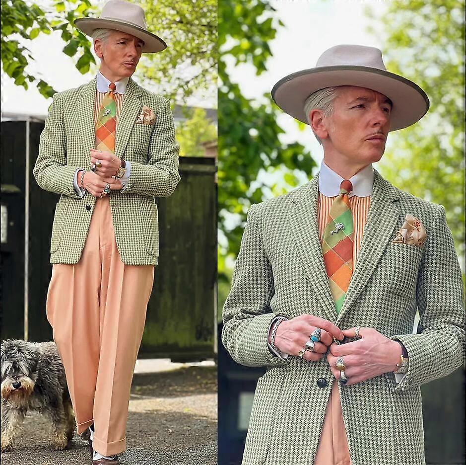 Green Houndstooth Men's Suits Peak Lapel Jacket Casual Slim Fit Party Tuxedos