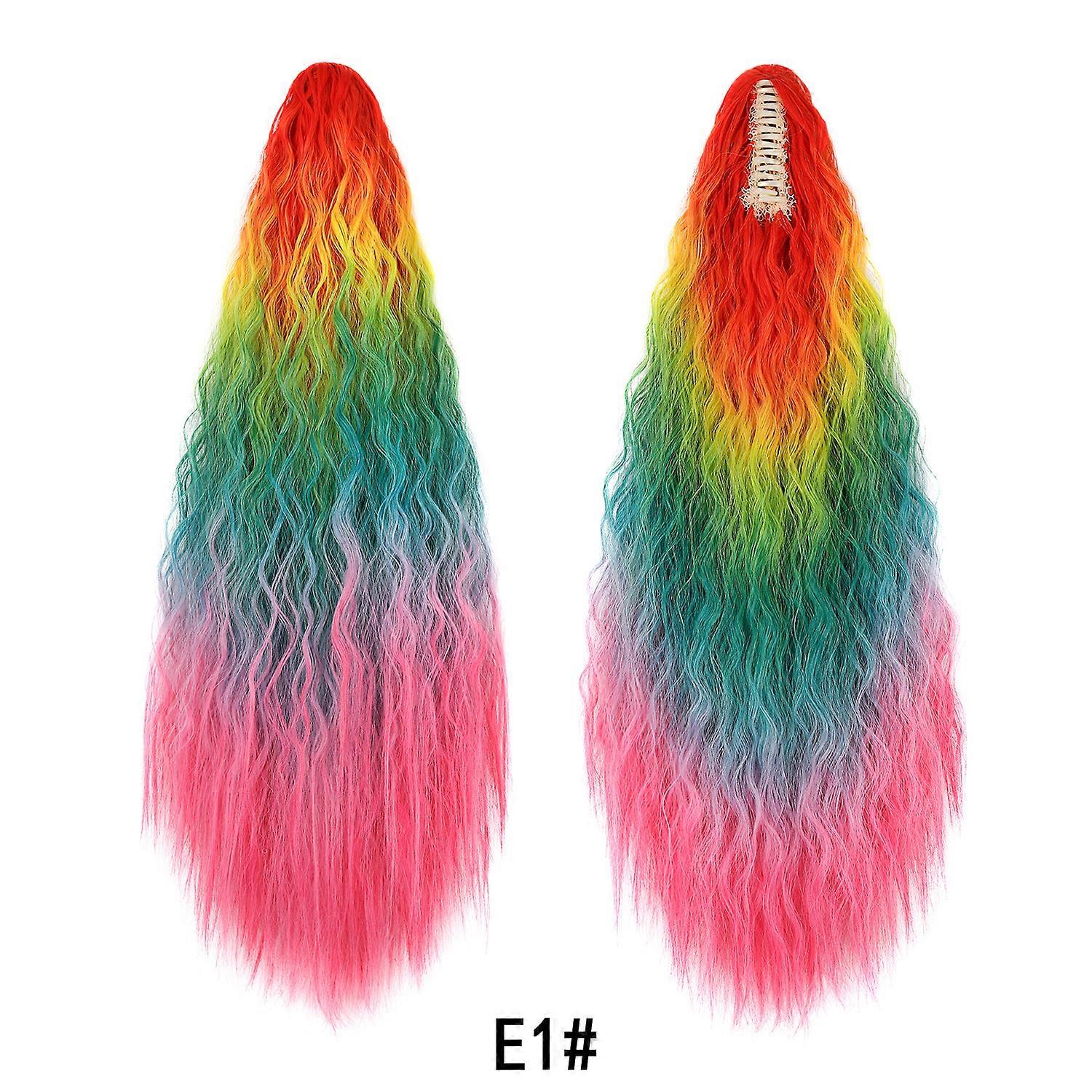 Women's long, colorful, curly ponytail wig with hair clips, dyed, permed, wavy curls.