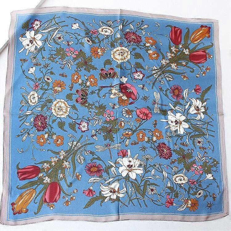 100% Silk Scarf Women Blue Flower Small Hand Neckerchief Wrap Bandana 53*53cm