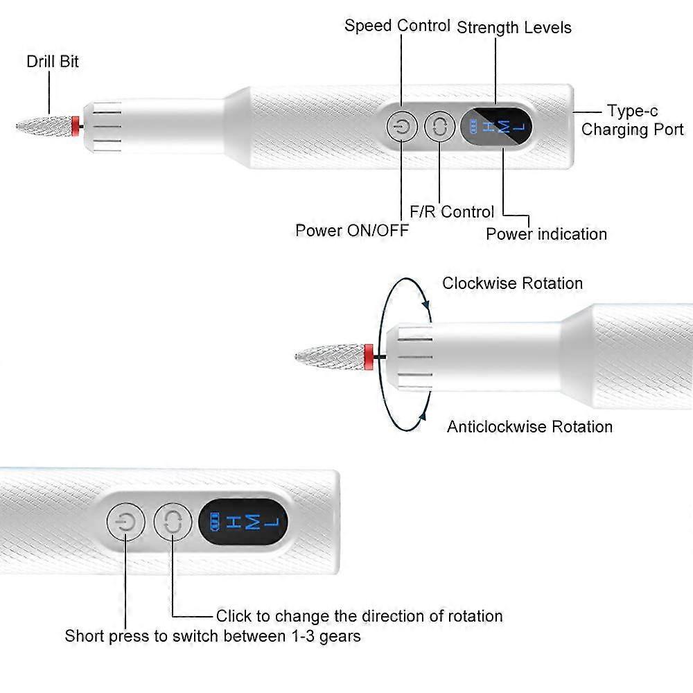 【Professional Nail Kit Set】The nail kits including:Upgraded electric manicure kit with 11 nail bits(including 1 Ceramic Nail Drill Bit), 36 abrasive belts with different grain sizes.Electric nail drill awesome for nail buffing, filing the shape of various nails, and smoothing calluses or hardened skin on your hands and feet. Multi-functional for easily grinding, carving, cutting, polishing, removing gel polish and cuticles for both acrylic nails and natural nails.【Cordless Nail Drill Machine】Offers a wide range of movements without the cord. A pen-shaped design for a comfortable grip without a cord.It features aluminum body that is excellent in heat dissipation, which keeps low noise and low vibration while drill for nails. Ergonomical handle gives a comfortable grip, manicure more eaiser.【Two directions Use】This nail drill is with a high and adjustable RPM (0-18000 RPM)speed by rotating the variable speed control knob easily,switch forward and reverse rotating suitable for Right-handers or Left-handers【Portable & Rechargeable】The drill nails machine for acrylic rechargeable offers 4 hours of manicure time after full charging. Press the power button to find out how much power is left. It supports manicuring while charging. With its super lightweight body, Our electric nail drill is easy to take so you can remove gel nail or acrylic nails anywhere you want.【Widely Use】Electric nail drill is suitable for most nail polishing heads,it is convenient to unload about 3 minutes. it is multi-functional for easily grinding, polishing, removing gel polish and cuticles for both acrylic nails and natural nails.