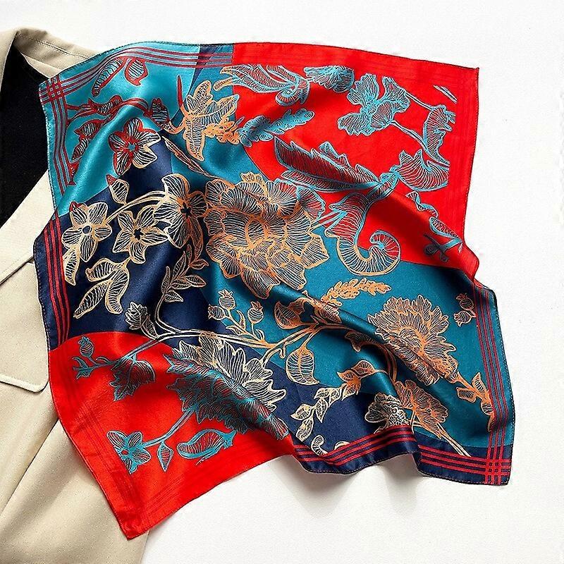 100% Silk Scarf Women Vintage Blue Red Kerchief Flower Small Square Wrap 53*53cm