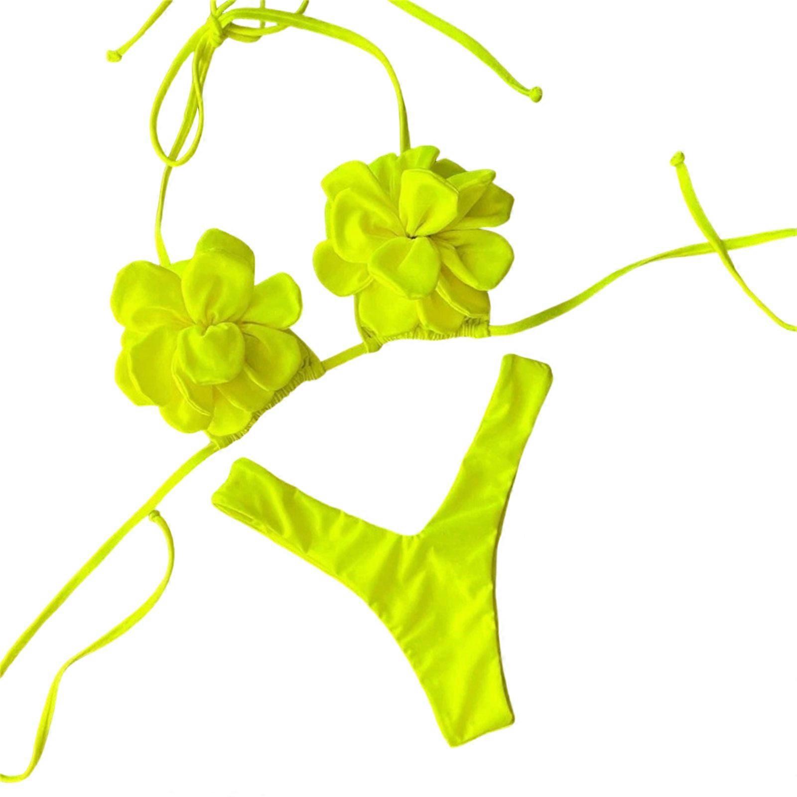 Women's Low Waist Swimsuit With Flower Decoration Two Piece Halterneck Thong Swimwears with Adjustable Neck Back Ties Yellow XL