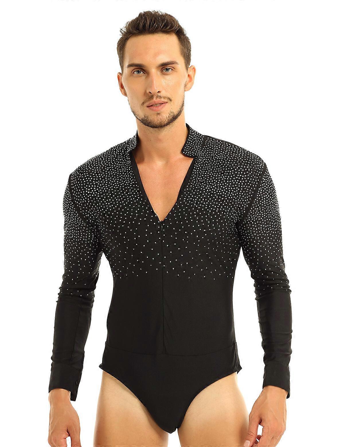 Men Shiny Rhinestone Stand Collar Long Sleeve Latin Dance Leotard Shirt Bodysuit