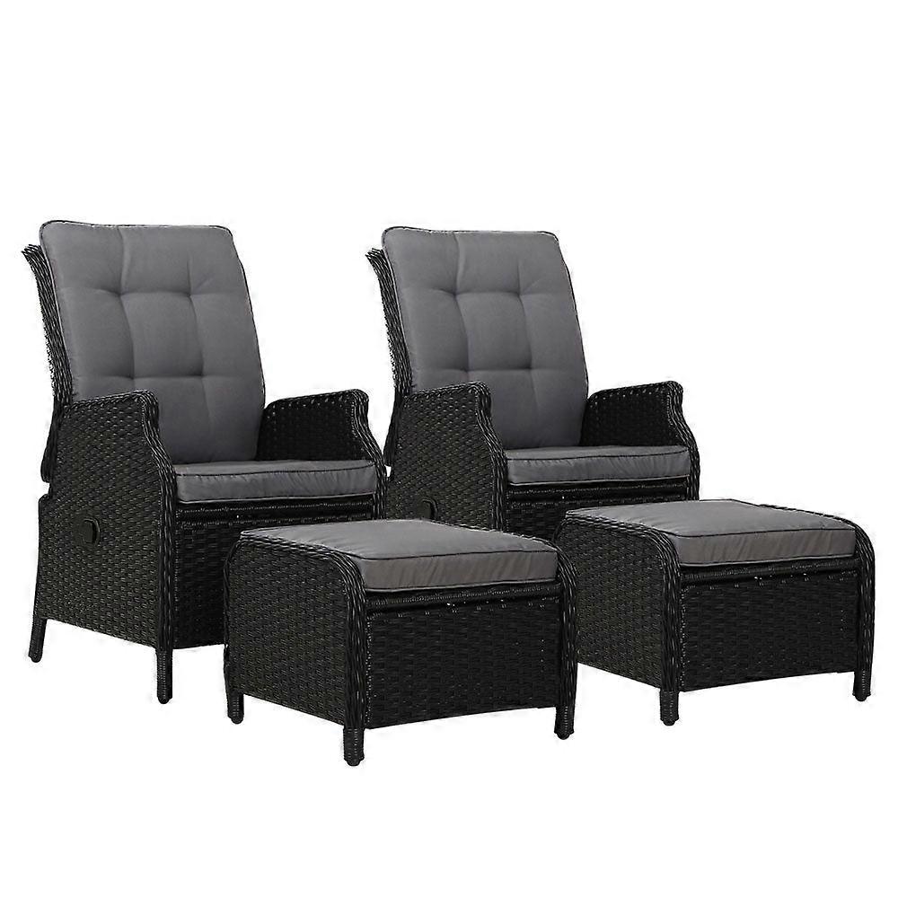HOD HEALTH AND HOME Australia has been operating online and instore for 8 years. All products come with a 1 year warranty, fast shipping and special offers added to our site daily.. Now You Can Really Sit Back And Chill In The Outdoors With The Gardeon Wicker Recliner Set. Comprising Two Oversized Recliners And Two Matching Ottoman The Outdoor Ensemble Is Everything You Need For Relaxation In Elegant Wicker Style. The Set Is Made Of Uv-Resistant And Weather-Resistant Pe Wicker So That You Never Have To Worry About Rust Corrosion Or Weathering Issues. The Heavy-Duty Powder-Coated Steel Frame Is Sturdy And Hardy And Will Stand Up To Robust Use Easily. More Importantly The Recliner Has An Backrest To Suit Your Angle Of Rest. Better Still The Seat Cushion Is Made Of High-Density Foam For Ultra-Comfort While The Zipped Cover Is Weather-Resistant Removable And Washable. Not Least The Useful Ottoman Is Just Perfect For Putting Your Feet Up. Yes It Is Indeed Paradise Under The Sun Moon And Stars. Have It Outdoors Or Indoors The Wicker Recliner Set Is Equally At Home With Its Exquisite Design And Unique Presence For Any Home Decor Enthusiast. Features Uv-Resistant And Weather-Resistant Pe Wicker Comfortable And Chic Non-Slip Feetbr> Sturdy Steel Frame Durable Powder Coating Premium High-Density Foam Cushions Weather-Resistant Removable And Washable Seat Cover Outdoor Or Indoor Use Weather-Resistant Backrest Matching Ottoman Specifications: Material: Pe Wicker Frame: Steel Framebr> Cushion Thickness: 7Cm Chair Dimensions: 57Cm X 61Cm X 94Cm Ottoman Dimensions: 45Cm X 50Xm X 38Cm Colour: Black Number Of Package : 2