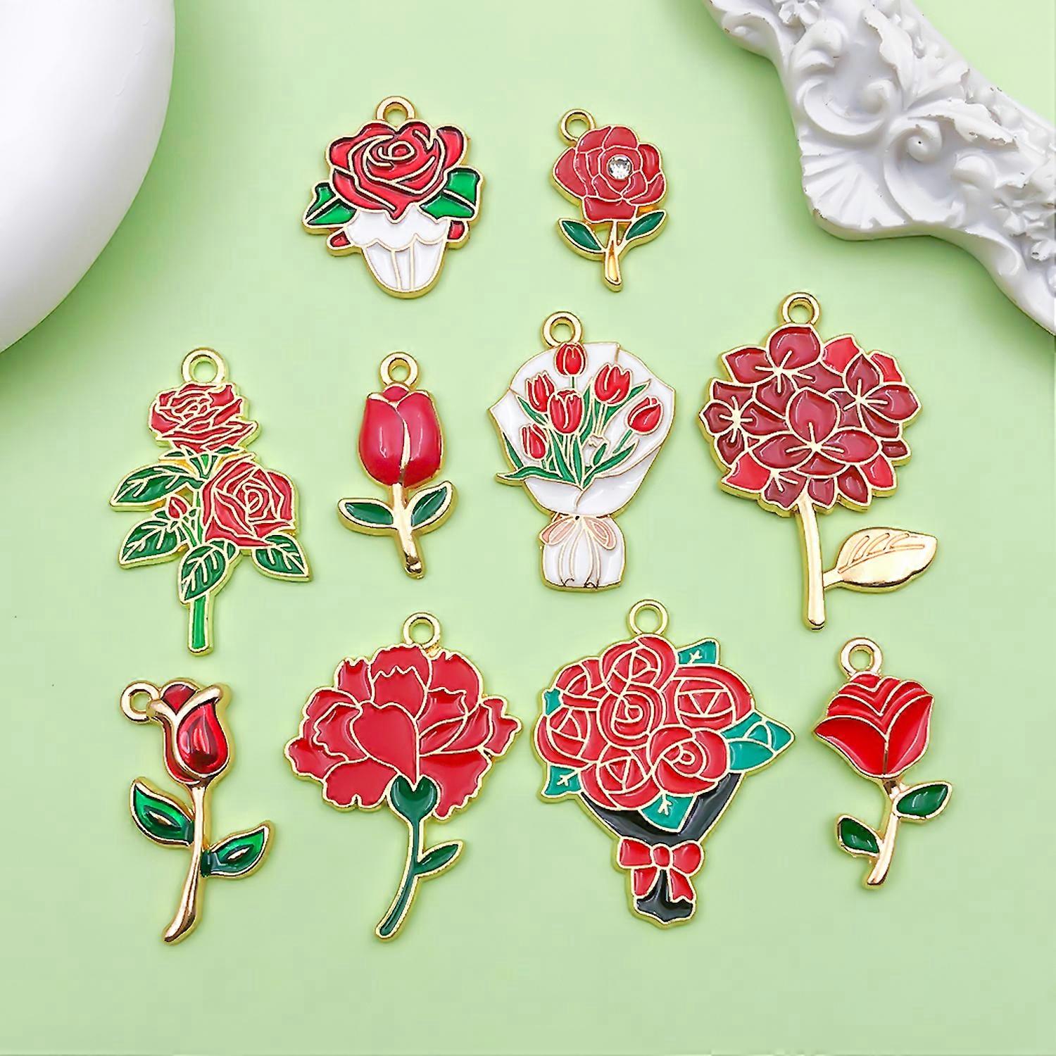 10pcs Red Enamel Flower Charms Alloy Rose Flower, Tulip Pendants for DIY Bracelet Necklace Earrings Jewelry Making Accessories