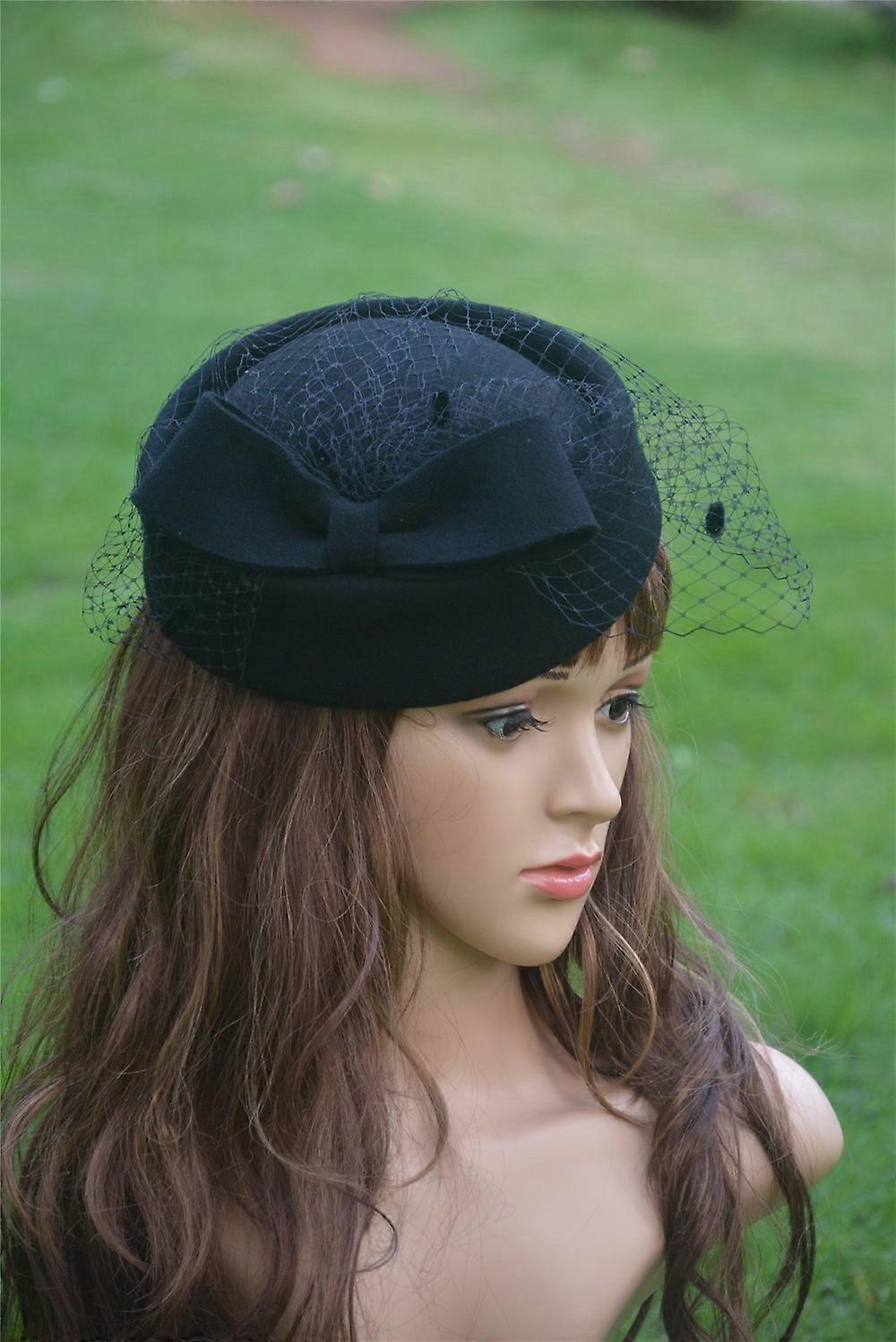 A080 Womens Dress Fascinator Wool Felt Pillbox Hat Party Wedding Bow Veil 3color