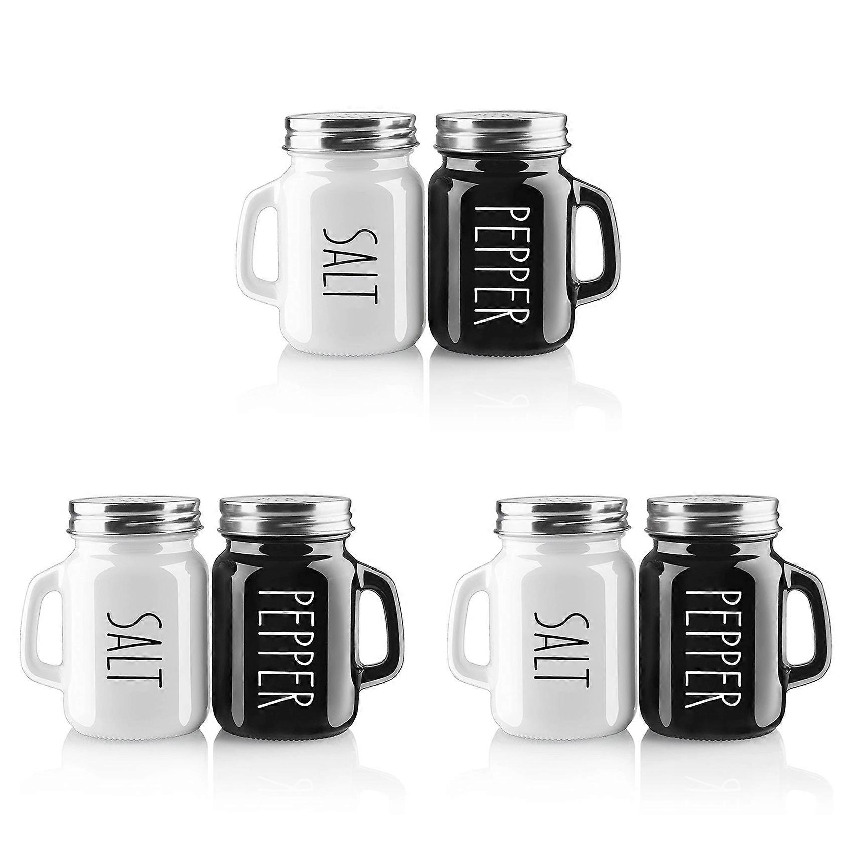 For Your Everyday Use: Each salt and pepper shaker holds about 4 ounces, they are the perfect size for frequent use and less frequent refillings. Letters on lid and words on side of container allows you two ways to affirm which spice is inside. This set of salt and pepper shakers are great for cooking to dispense or table use when you are eating. Super Cute Farmhouse Design: Designed with modern style and country look, our white and black shakers set will surely add a vintage touch to your countertop or table and fit perfectly with modern farmhouse decor, cute kitchen accessories or rustic home decor. The shape gives proper hand feel and weighting so you can dispense light or heavy as you prefer. Durable and Convenient: These cute salt and pepper shakers are made of lead free glass and the lids of farmhouse salt and pepper shakers are made of premium stainless steel. The little handles make it easy to grab and use for cooking. Pours You the Perfect Amount: Have you ever had a salt/pepper shaker that either the holes were too big or too little and end up ruining your meal? Not with these, this 13-holes salt pepper shaker is easier to sprinkle salt or pepper evenly on food. Easy to Refill and Clean: Simply unscrew the stainless steel lids for quick and easy refilling, the opening is wide so you don't need a funnel or worry about spills or creating a mess. Also, the shakers are super easy to clean, handwash only.(Note: please wash and dry before the first use) Material:glass+stainless steel colour:black+white Package Contents: 6 x Seasoning jar